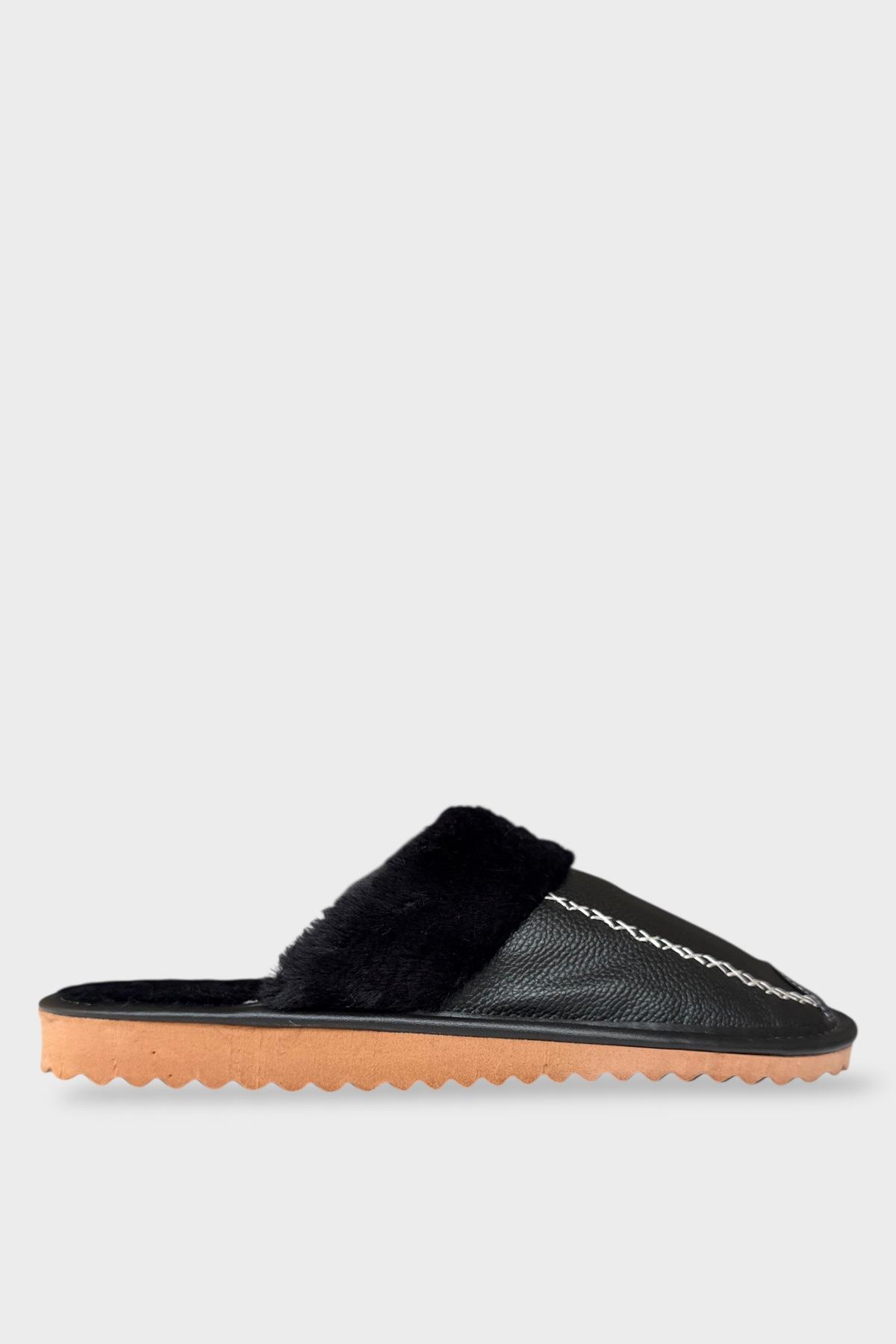 Deri Görünümlü Kürklü Erkek Ev Terliği SİYAH