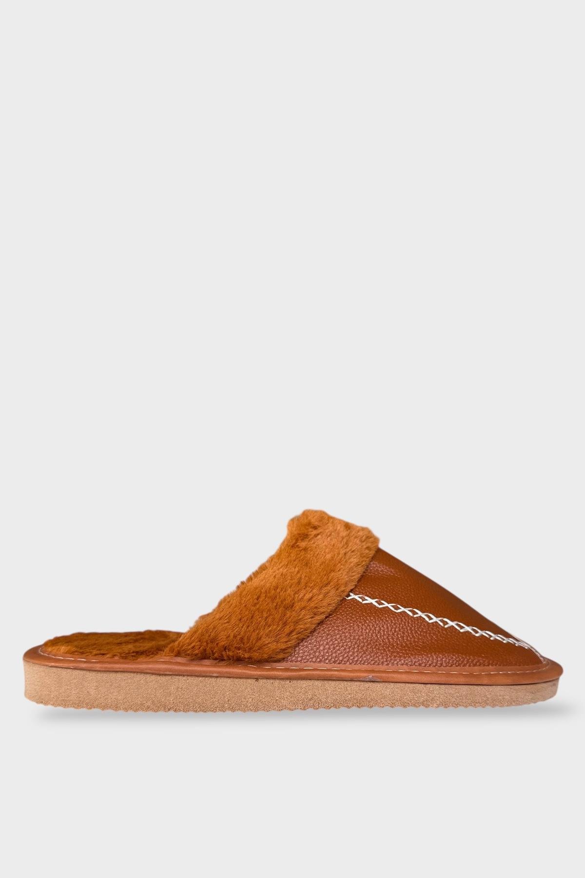 Deri Görünümlü Kürklü Erkek Ev Terliği TABA (3383)