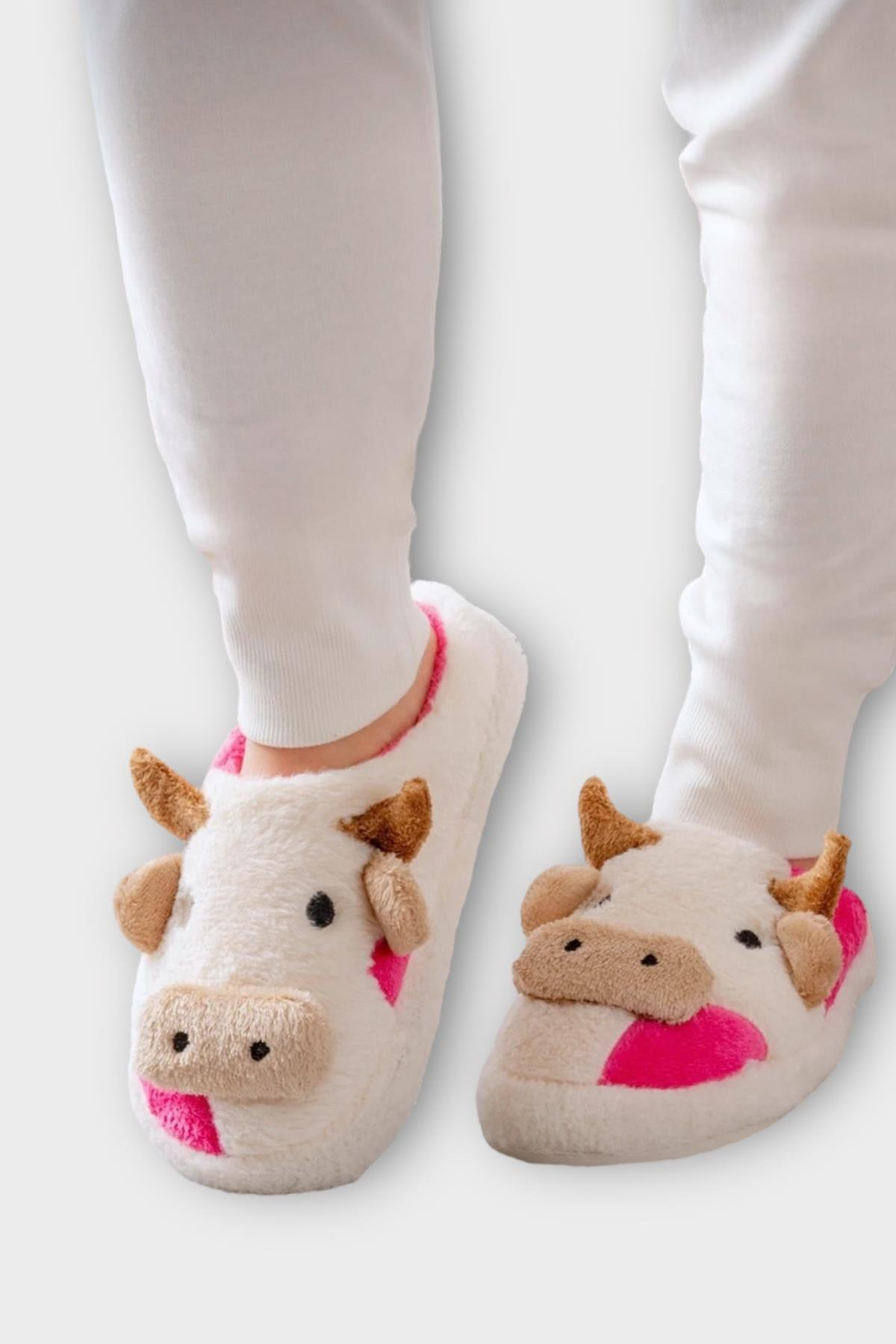 İnek Figürlü Nakışlı Kaydırmaz Taban Kışlık Unisex Ev Terliği BEYAZ - FUŞYA