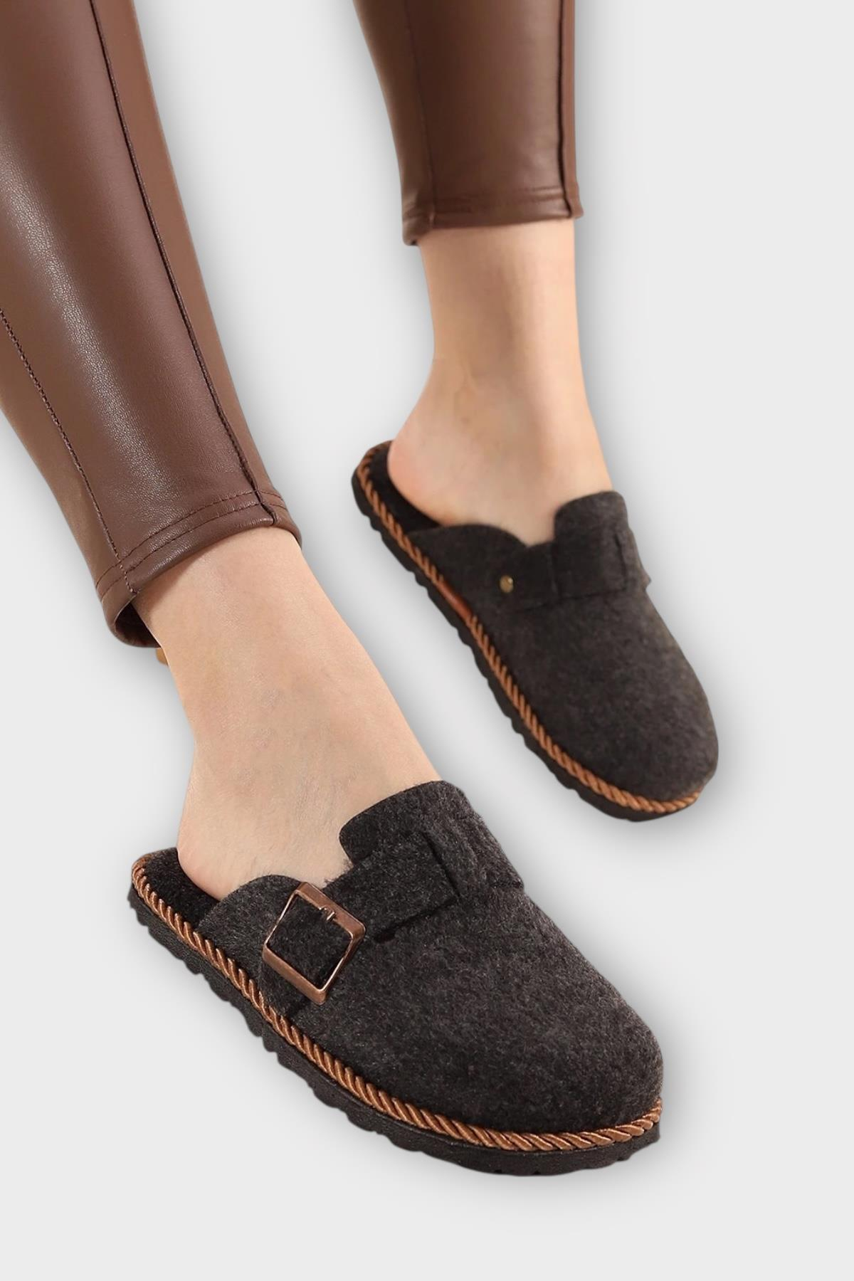 Tokalı Keçe Kumaşlı Ev Terliği FÜME